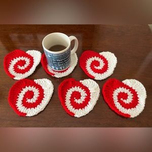 Set of Six Crocheted Red & White Heart Shaped Coasters. Handmade. Never used. Use Two for a romantic valentine evening or use all 6 for a Galentine party. Fun to display every year in February ❤️