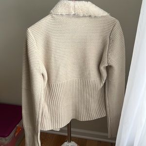 Gorgeous knit jacket by La Cite. This beauty is made of suede like acrylic with faux shearling collar and wool knit sleeves and back. Draped open front with single front horn button closure. Full knit sleeves and back. Two side pockets. No snags to fabric, no stains, no tears, rips or odor. Absolutely stunning in this soft ivory colorway. New with tags. Size Large: Approx. chest: 20 1/2, pit: 20 1/2; shoulder: 17, cbl: 22 1/2, sleeve: 27.