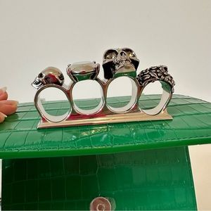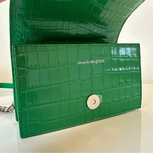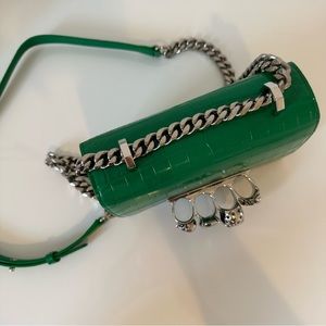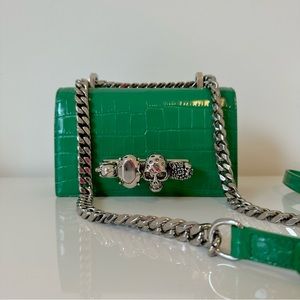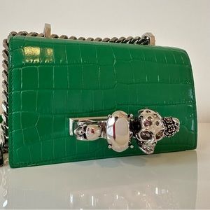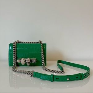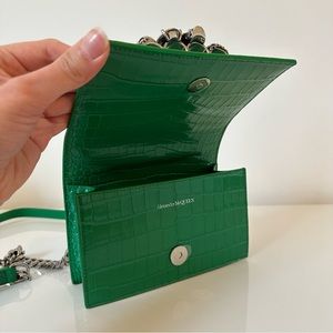 Green ‘Jewelled Satchel Mini’ shoulder bag from Alexander McQueen. Made of calf leather with a crocodile skin effect, this model features a magnetic snap fastening and is decorated with a decorative ring handle embellished with Swarovski crystals, shoulder strap with a chain insert, silver-tone metal hardware and one internal compartment with one card slot.