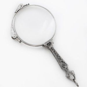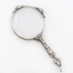 This fabulous platinum lorgnette, with it's fancy openwork handle and twinkling Diamonds. Sleek and modern Edwardian and Art Deco styles together creating a stylish pieces that still found room for the fine forms and lines of previous eras within their elegant architecture.