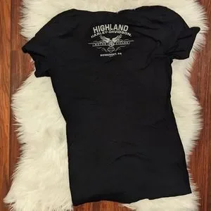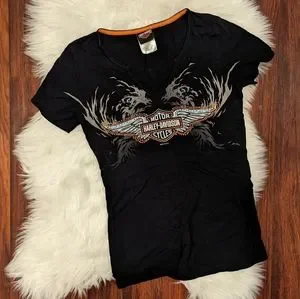 excellent used condition. size medium however the size tag has been removed. Harley Davidson short sleeve V-neck T-shirt. black in color with orange and gray bar and shield logo with rhinestone gem bling.