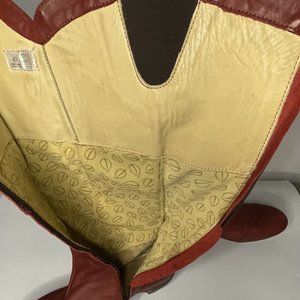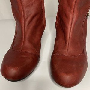 Gorgeous super soft leather in a RED Burgandy. Height in front is at knee (for me, I am 5'6"). Leather in a patchwork pattern, with X detail near top and stretch fabric on back of boot top to give some adjustment for fit.