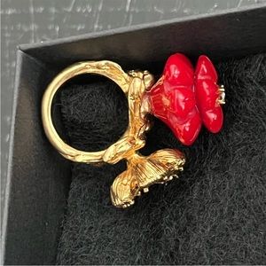 Authentic Alexander McQueen flower ring. Stunning statement piece. Beautiful Red and gold flowers adorn with crystals. A small signature skull is tucked away on the side. Brilliantly detailed. Vintage. Rare.