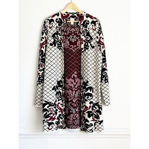 Chico’s Cardigan Jacket Sz 3 XL Black Ivory Stretch Polyester Contrast Scroll