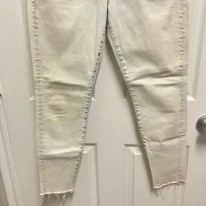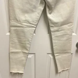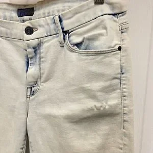 Size 32. Acid wash denim skinny jeans. Ankle cut with raw frayed hems. Small elastic strecth in upper thigh shown in 4th picture. No trades. N3-15