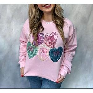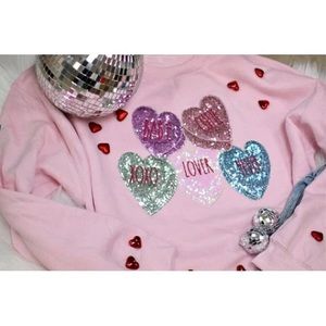 Celebrate love and sparkle in style with this charming pink sweatshirt! Featuring five glittering sequin conversation hearts that say "Babe," "Cutie," "Lover," "XOXO," and "Forever," this cozy top adds a playful touch to any Valentine’s Day outfit. Perfect for spreading love and staying comfy, this sweatshirt is a must-have for your holiday wardrobe. Runs True to Size. 80% Cotton and 20% Polyester.