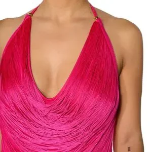 The Callie Pink Fuchsia Layered Fringe Cowl Maxi Dress is made from a sleek, bodycon base fabrication and features a cowl neck, adjustable halter silhouette, open back, and a cascading fringe tassel design. Complete with a maxi length, sexy side slit, and a slip-on fit—style with stiletto pumps and a matching fringe clutch for a bold, fierce look.