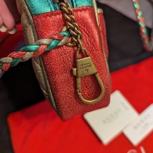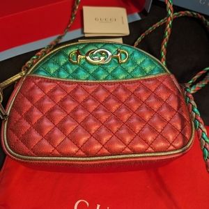 Gucci Trapuntata Quilted Metallic Calfskin Leather Crossbody Bag in red gold green. Full inclusion... Gucci dustbag, Gucci box, care cards, and Certificate of Authenticity. Brand new, mint condition. Made in Italy. Gorgeous shimmery calfskin leather. One outside pocket and hidden card holder slots in the interior. Hand braided crossbody strap. This bag does fit a large phone and lots more! GORGEOUS!