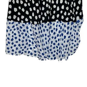 Silk contrasting color polka dot long sleeve maxi dress. V neck, wrap-style waist, tiered hem, hidden back zipper. Please note a small flaw-a barely noticeable pull in the folds of the neckline.