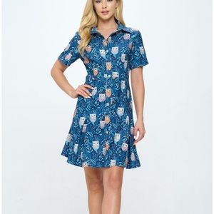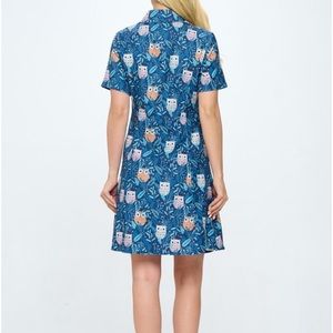 Cute Owl print dress, button front, collar, short sleeve, 2 pockets, 2 pleats towards bottom. Flattering style. 95% polyester and 5% spandex. Fabric is called a lightweight corduroy. Blue background.