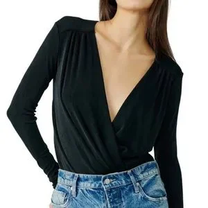 This bodysuit by Intimately Free People features long sleeves, surplice v-neckline, gusset snap button closure with thong back, and luminous stretch knit fabrication.