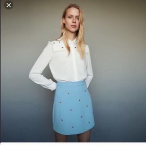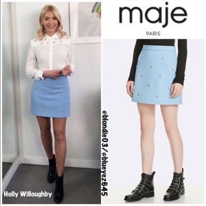 This is the “Jizie” Sky blue bee Embellished crepe mini skirt by Maje in designer size 1, which is equivalent to a US size small. This skirt was seen on Holly Willoughby. It is brand new with tags! Thanks for looking!!!