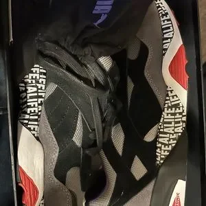 Puma alife collaboration. Purple grey and black. Shoes have been lightly worn once. Only real sign of wear is the alife has come off the insole, that is due to also the age of the shoe. Also come with extra laces in a dust bag.