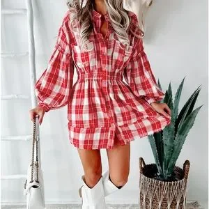 Check out this fun Red Plaid, Button-Down Mini Dress