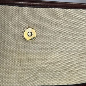 Canvas and leather cross-body bag by Oroton of Sydney. Used. In good condition. A few small spots and age marks. Body is 9” w X 7” h.
