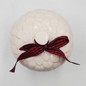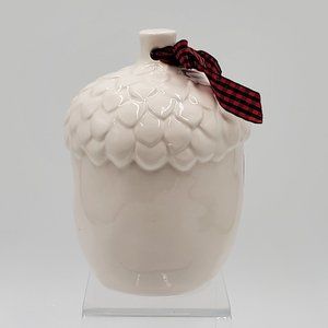 • white ceramic, acorn-shaped birdhouse with original, plaid, grosgrain ribbon