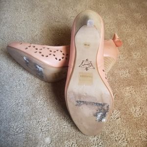 Leather upper, synthetic outsole, approx 3.5 in heel, laser cut pattern with fabric ribbon detail