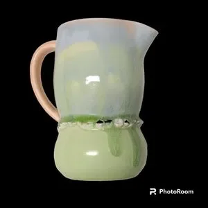 Yes, teeth. Not real teeth, but real enough to freak out everyone at the table. This is handmade pottery, bought years ago and never used. No wear or chips, only as-made unique colorings. It's a small pitcher with big impact. Holds 24 ounces (3 cups) if you fill to the bottom of the spout and 4 cups if you fill to the tippy top.
