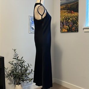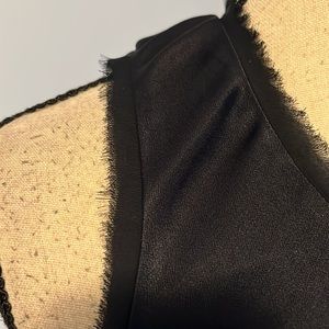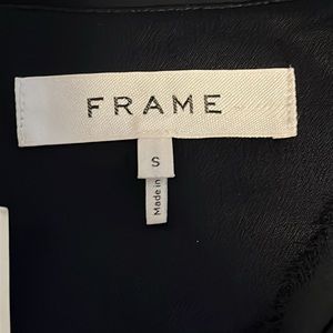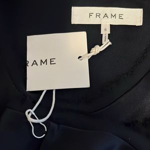 NWT FRAME sleeveless dress in dark navy. Scoop neckline and armholes are edged in frayed georgette. Pullover styling. Skirt flares slightly towards hem. Slit in bottom hem at R side as shown. Tasteful, yet sexy!