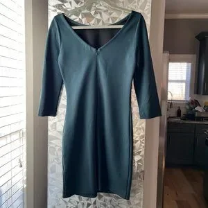 Teal boatneck dress with v back and zip closure. About mid-thigh length. Worn maybe twice, and in excellent condition.