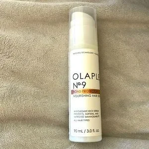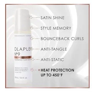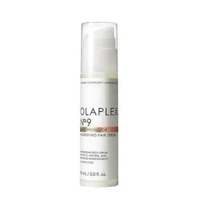 The Nº.9 Bond Protector Nourishing Hair Serum, infused with patented OLAPLEX Bond Building Technology, is a silicone-free antioxidant hair serum that instantly shields hair from pollution and protects against heat damage while adding satin shine and reducing static and tangles.