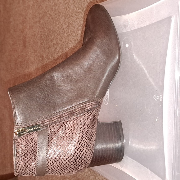 Anne Klein, size 9m, brown heeled boots. Zipper inside of boots. Textured pattern on back side of boots. Heel is 2.25 inches. Upper material is leather. Excellent used condition.