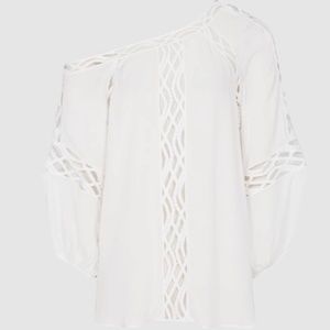 The Leena blouse in ivory is cut from a luxuriously, lightweight fabric into a relaxed silhouette. It features an artfully draped neckline and contemporary, graphic lace panelling. Worn once and like new.