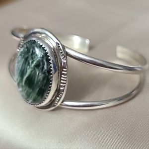 Here is an outstanding vintage Navajo artisan & silversmith Calvin Tom creation cuff bracelet donning an extremely rare crystal called seraphinite