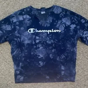 Blue tie dye Champion sweatshirt with silver Champion logo. Size medium but fits like small
