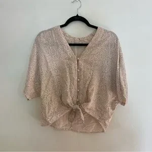 Lightwieght and flowy shirtsleeve button up with tie front detailing. Soft neutral leopard print is perfect for spring.