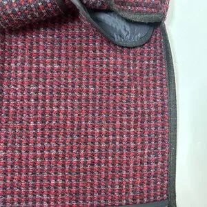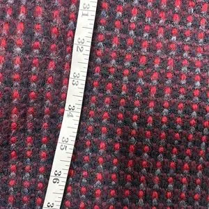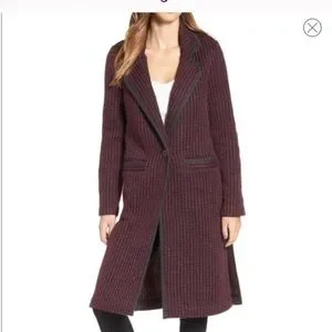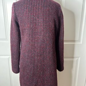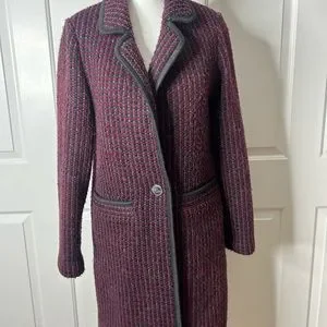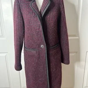 wool-blend tweed coat. Woven shades of berry and blue. Notch collar. Single button closure. Split hem. Front slash pockets. Unlined. Material