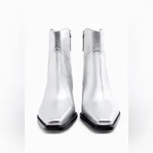 NWT. Zara Metallic Silver Cowboy-Style Leather Ankle Boots. Metallic effect finish. Zip closure. Square toe finish. Heel height: 5.5 cm/2,5". Size 8, 9. Ref.1122/110.
