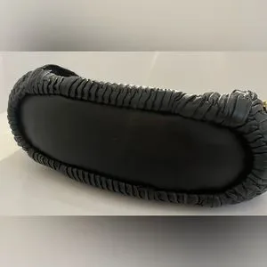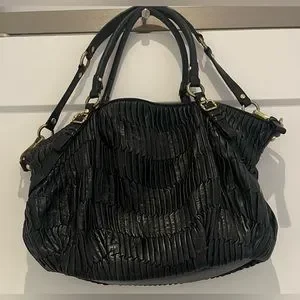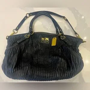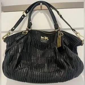 Authentic Coach Madison Handbag in black leather with gold hardware. This leather bag is made of gathered leather giving it a unique look and feel. The interior is a purple satin. The bag features handles and a shoulder strap. Please note these issues as reflected in price: