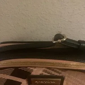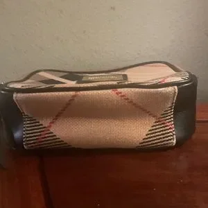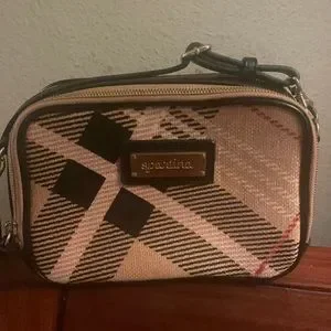 Gorgeous plaid canvas and leather with gold tone accented hardware. Long strap is adjustable and removable. Very clean inside and outside. No rubs on corners. Outside pocket is very clean. Interior lining clean with pockets and card slots. Good functioning top zippers. Please see pictures. Dimensions are approximately 6”Hx8”Lx3”W. This bag is in very good preloved preowned condition. All reasonable offers considered.
