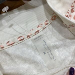 NWOT. Zuda, women’s size 2X, zip-up top. Cream color with shimmery rose gold leopard pattern. Rose gold zipper and toggles on drawstrings. Elastic drawstring to cinch waist. Hem is cut a little higher in front an longer on sides and back for a soft ruffle look on hem when cinched. This zip-up top is a lighter weight. Great over a tank/tee for a cute work look and then take it right to a date night or drinks with the girls afterwards. Any pair of leggings or jeans would be transformed into something special with this top! Perfect for the girl who loves a little sparkle in her life and her wardrobe! 67% rayon, 28% cotton. Has plenty of stretch. Measures approx. 25” long in front and 31” at longest point on sides. Measures approx. 29” pit to pit, in inches. Machine wash cold, delicate cycle. Tumble dry low. New, no price tag but still has plastic tag was attached to on it, see photo. Stored in smoke-free home.