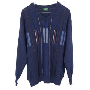 VTG 90s Kingfield Navy Blue Wool V-Neck Geometric Embroidered Velvet Sweater L