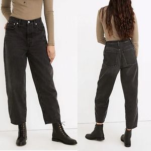 I adore these balloon barrel leg jeans by Madewell.  Faded washed black wash called Noll wash.  High rise waisted and sit below the natural waist.  Cropped ankle length. Cheeky rear fit. Style MD690. 100% cotton, no stretch. Gently used preowned condition. Check out the video of this gem in its current condition!