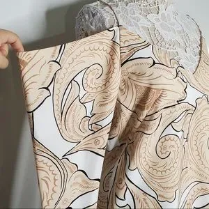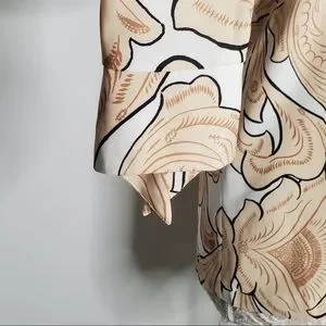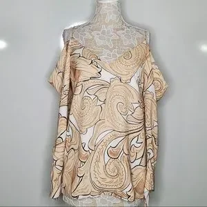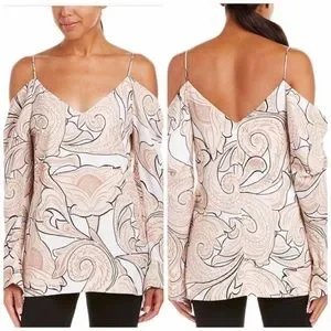 Excellent condition. smoke free home. No holes, rips or stains. Colors may very due to screen and lighting. Color/Pattern: Ivory Andorra. Details: V-Neck, Draped Off-The-Shoulder Sleeves With Split Cuffs Center Back Zipper Closure 100% Polyester Machine Wash. retails $150