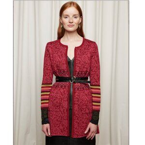 The first long cardigan by Oleana, originally part of the Silk Road collection. The pattern is inspired by Arabic ornaments and is complemented by a flattering accent pattern waistline and contrasting color stripes at the wrists. Adorned with Oleana's signature curated designer buttons, this cardigan has been a classic from the start and continues to be a timeless favorite.