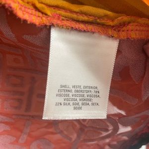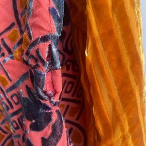 Velvet pattern in shades of coral, gold, and teal.