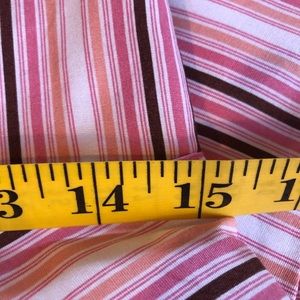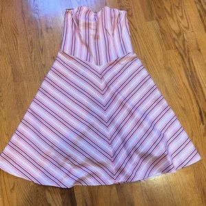 Teeze Me strapless pink brown orange striped Dress, fully lined with brown tulle hem, zipper back, fitted bodice and full skirt. Size 5.