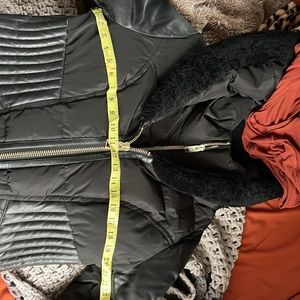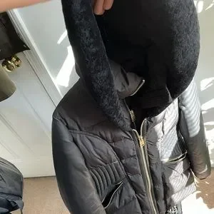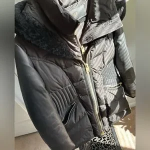 Great quality winter jacket. Stylish leather and fur with gold zippers and detail. Heavy weight to keep you warm. Synched waist. Brand new condition.