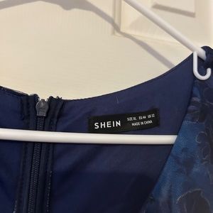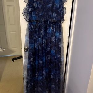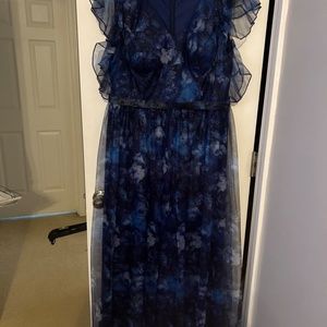 Beautiful navy blue with floral blues. Inset bra, umpire waist. Worn once