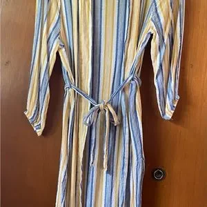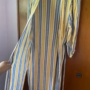 Cute beach duster/cover-up light weight and airy. EUC!!! It was only worn a handful of times. Comes with the sash too. It also has cute summer colors blue, golden yellow, and some silver.