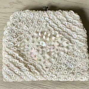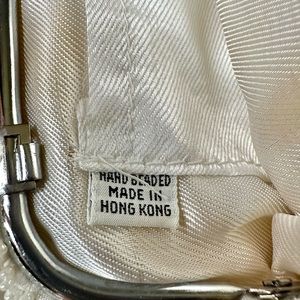 tags: evening Bag, wedding Bag, clutch, Wristlet, sequin, beaded, ivory, white, kiss lock clasp, vintage, Hong Kong, pearl