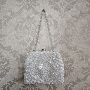 Vintage Hand Beaded Sequin & Pearl Wedding Wristlet Bag. Kiss Lock Clasp, Satin Lined Made in Hong Kong