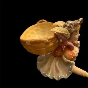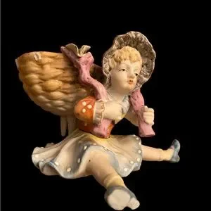 Vintage ceramic figurine planter / trinket holder hand painted in Japan UCAGCO. Both legs have been broken and glued, not visible from the top. On handle one the basket is missing. Please see photos.