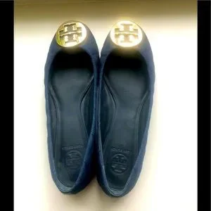 Fabulous Tory Burch Blue Tight Suede Travel Ballet Flats With Polished Brass Emblem. EUC. Tops EUC / Leather Soles GUC. Item is pre-sanitized and ready to wear.