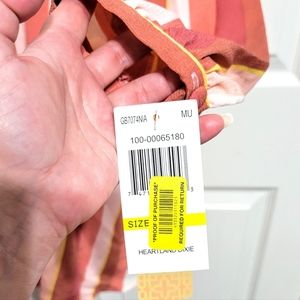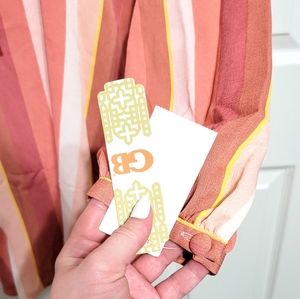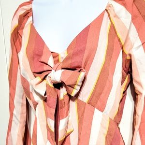 New with tags Gianni Bini Dress with peach, yellow, mauve, cream, and pink stripe pattern with front bow. Buttons at the sleeve ends and stretchy waist and shoulders.
