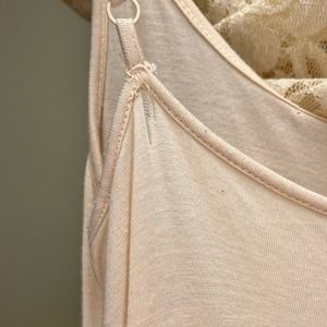 Cream lace dress with connected nude rayon slip style underneath. This can be disconnected and worn separate. Very soft. Sleeveless. Straps on slip are adjustable.